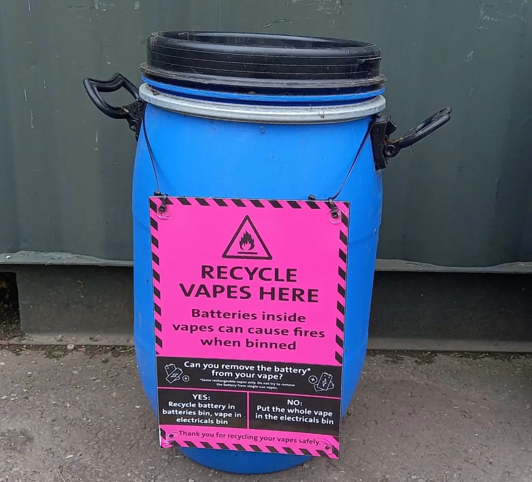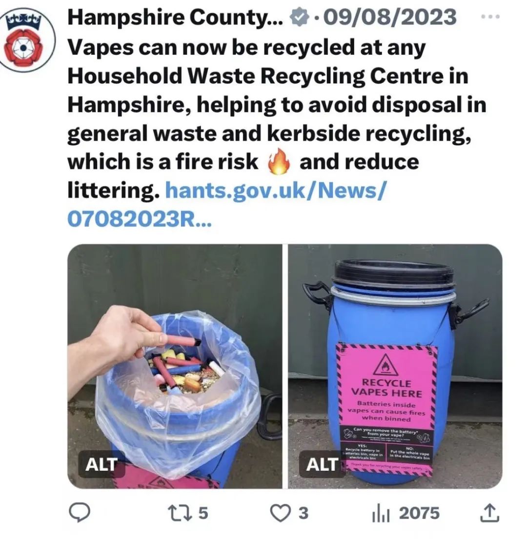 作为参考,他还向我们展示了他所实拍的英国街头由政府设置的电子烟回收箱,以及当地最新发布与的,号召主动将废弃电子烟投递到回收箱的社交媒体: