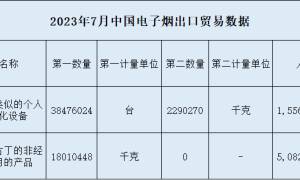 2023年7月份电子烟出口贸易数据已出炉。海关总署数据显示,7月我国电子烟产品(包括电子烟及类似的个人电子雾化设备、其他含尼古丁的非经燃烧吸用的产品)的出口额为66.39亿元(66...